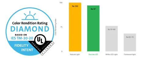 SunLike 在UL色彩保真度评级中被评为最高品质钻石,可提供最接近自然光的最高品质光线。
