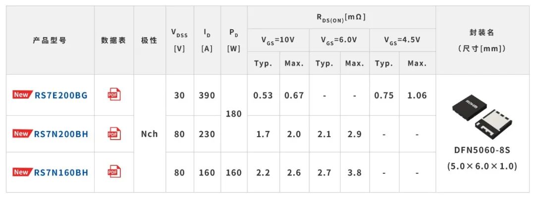 新产品均采用新开发的DFN5060-8S(5.0mm×6.0mm)封装,与以往的HSOP8(5.0mm×6.0mm)封装相比,封装内的芯片可用面积增加了约65%。这使得新产品能够以5.0mm×6.0mm的封装尺寸实现业界超低导通电阻,30V产品“RS7E200BG”的导通电阻仅为0.53mΩ(Typ.),80V产品“RS7N200BH”仅为1.7mΩ(Typ.),非常有助于提高服务器电源电路的效率。